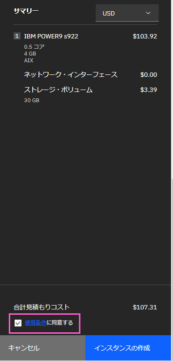 ・「使用条件に同意する」に「✓」を入れ「インスタンスの作成」をクリックします。