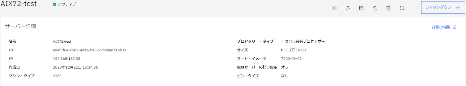 ・「名前」の「AIX72_test」の項目がリンクになっているのでクリックし、作成したインスタンスの「詳細」を確認します。
