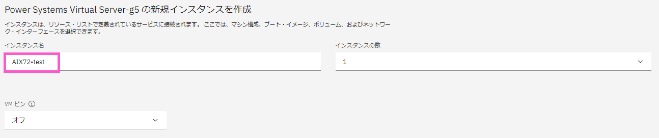 ・「インスタンス名」に任意のインスタンス名を入力します。インスタンス名は「AIX72-test」にしました。作成するインスタンスは1つなので「インスタンスの数」が「1」になっていることを確認します。