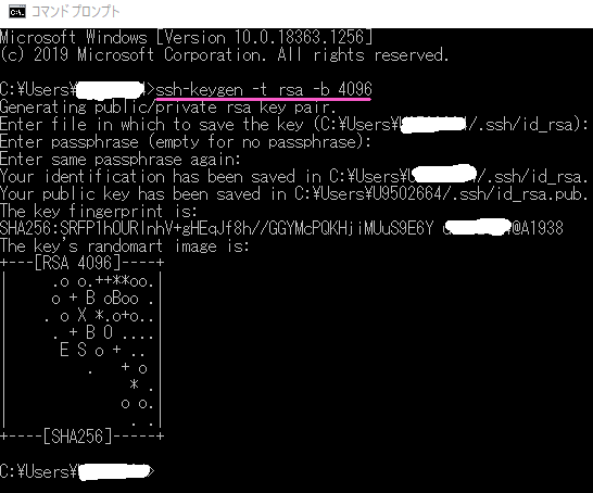 ・Windows標準搭載の「コマンドプロンプト」をPC上で立ち上げ、「ssh-keygen」コマンドを利用してSSHの秘密鍵と公開鍵を作成します。
