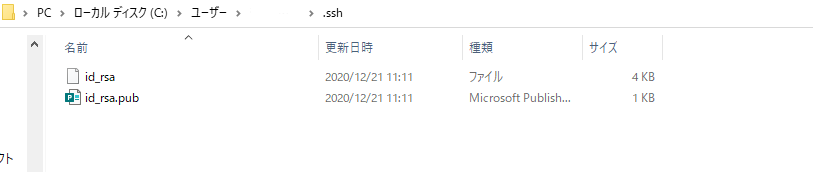 ・SSH秘密鍵「id_rsa」と公開鍵「id_rsa.pub」が作成できたことを、PC上で確認します。