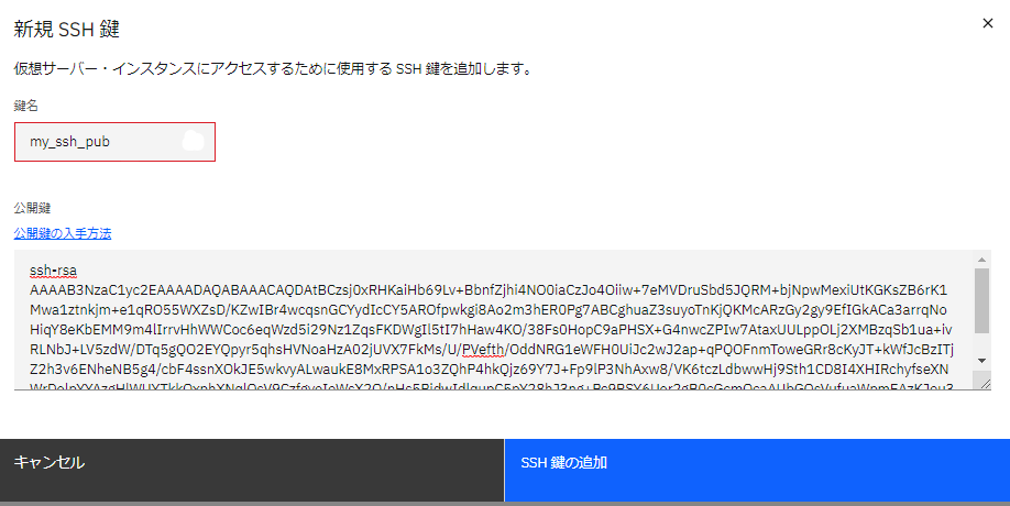 ・「鍵名」に任意のSSH鍵名を入力し(「my_ssh_pub」としました)、「公開鍵」には先ほどコピーした公開鍵の文字列をペーストします。