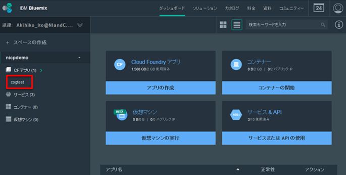 ダッシュボード→CFアプリ から先ほど作成したアプリを選択します。