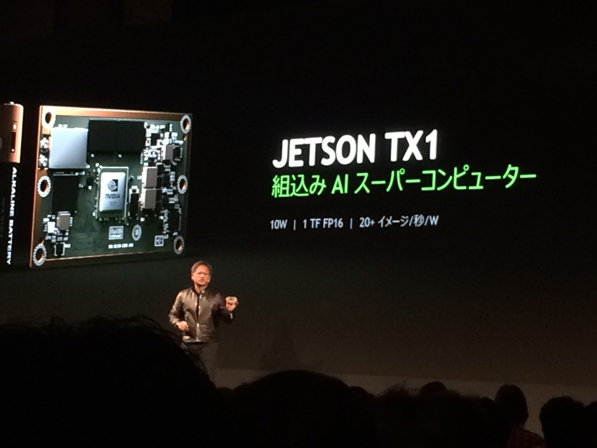 続いてジェン・スン・ファン氏は、IoT機器に搭載することを目的とした小型のGPU搭載マシン「Jetson TX1」を紹介しました。この機器は乾電池と同じ大きさで、動作にはわずか10Wという低消費電力で1Tflopsもの処理能力をもつことが売りです。Jetsonを使えば、各IoT機器が自己学習し動作することが可能となります。