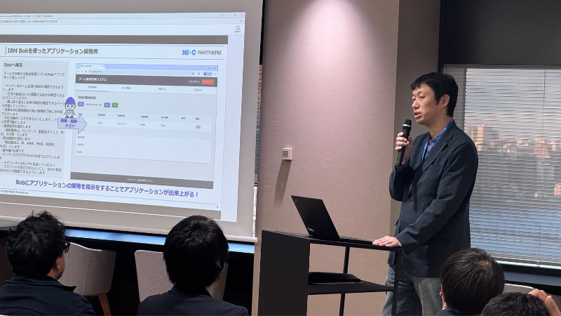 IBM Bobを用いたwatsonx OrchestrateのAIエージェント開発について紹介。MCPサーバを活用することで、お客様固有コーディングルールへの準拠を、開発者の操作に依存せずに開発を進められる効率性の高さなどが紹介されました。参加者から他社製品との違いについて質問があり、IBM Bobのドキュメント生成機能の高さなど、具体的な優位点や知見を共有しました。